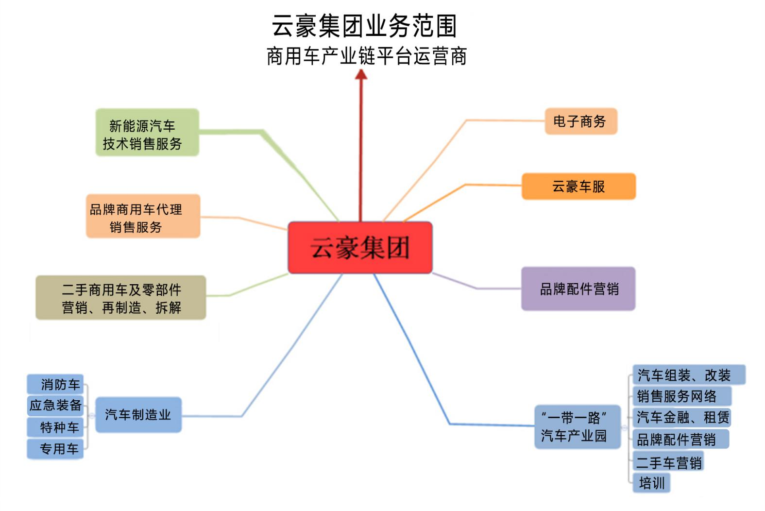 云豪投资(北京)有限公司简称“云豪集团”启始于1999年,主营业务集商用车整车定制和组装、专用车改装、整车营销网络、互联网营销、商用车零部件营销、商用车维修服务、商用车应用技术培训、二手车营销、汽车金融、车险、新能源汽车服务等主营业务为一体的商用车实业公司。